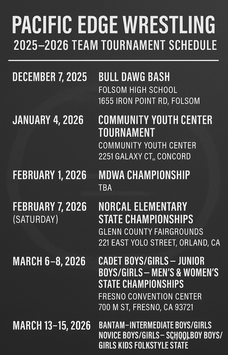 Tournaments are not required but they are highly recommended. Pacific Edge does not Facilitate tournaments for non-competitive levels, but encourages parents to register for tournaments themselves through Trackwrestling.com under “events” and the youth division. Our club is registered through USA wrestling, and anyone who practices in our facility can register under our club name.